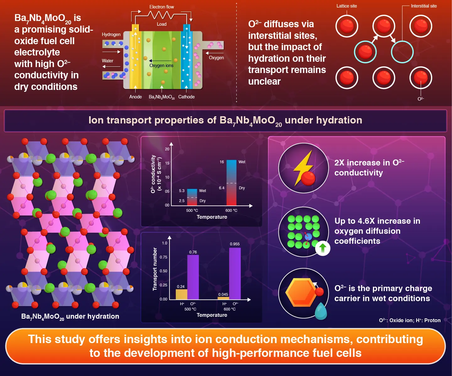 This study addresses a key knowledge gap in interstitial oxygen conductors by revealing how hydration enhances O2‒ conductivity and mobility in Ba7Nb4MoO20. These findings could lead to the development of more durable and efficient fuel cells that operate at lower temperatures, helping to overcome a major barrier to their wider adoption.