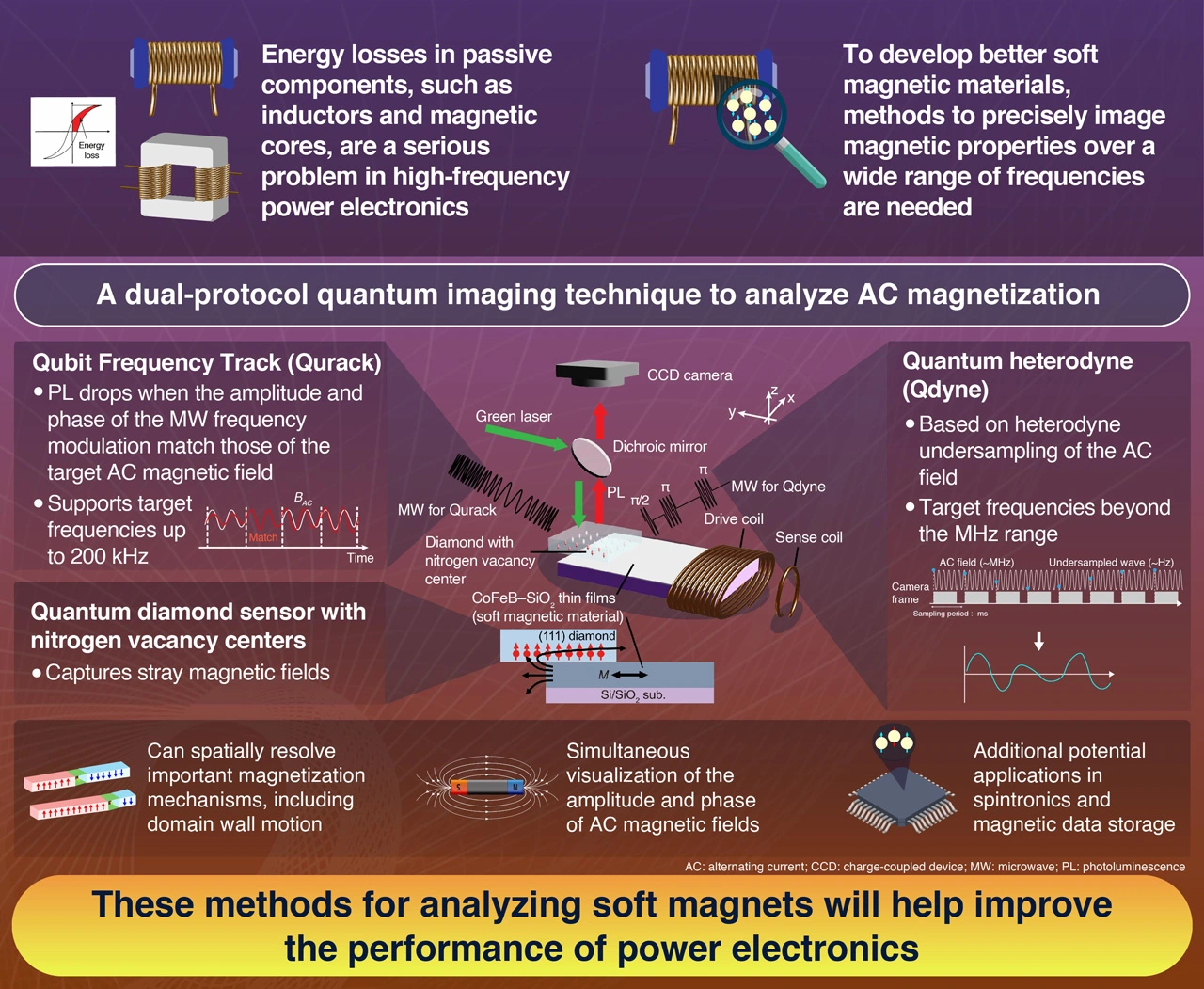 Diamond quantum sensors can be used to analyze the magnetization response of soft magnetic materials used in power electronics; report scientists based on collaborative research. Using a novel imaging technique, they developed quantum protocols to simultaneously image both the amplitude and phase of AC stray fields over a wide frequency range up to 2.3 MHz. Their results demonstrate that quantum sensing is a powerful tool for developing advanced magnetic materials across diverse applications.