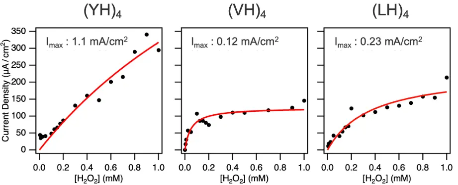On applying a reduction current to the electrodes, the iron in hemin is reduced to the ferrous (+2) oxidation state. It can then reduce H2O2, thereby recovering its ferric oxidation state. Comparisons of how quickly the hemin bound structures reduce H2O2 revealed that hemin bound to (YH)4 had the highest catalytic activity, although this is unlikely due to the greater density of hemin at this surface since the densities for all three dipeptides were all within the same order of magnitude. Instead, the researchers suggest the greater reducing power of hemin bound to (YH)4 is on account of the more stable scaffold offered by that dipeptide (Figure 4).