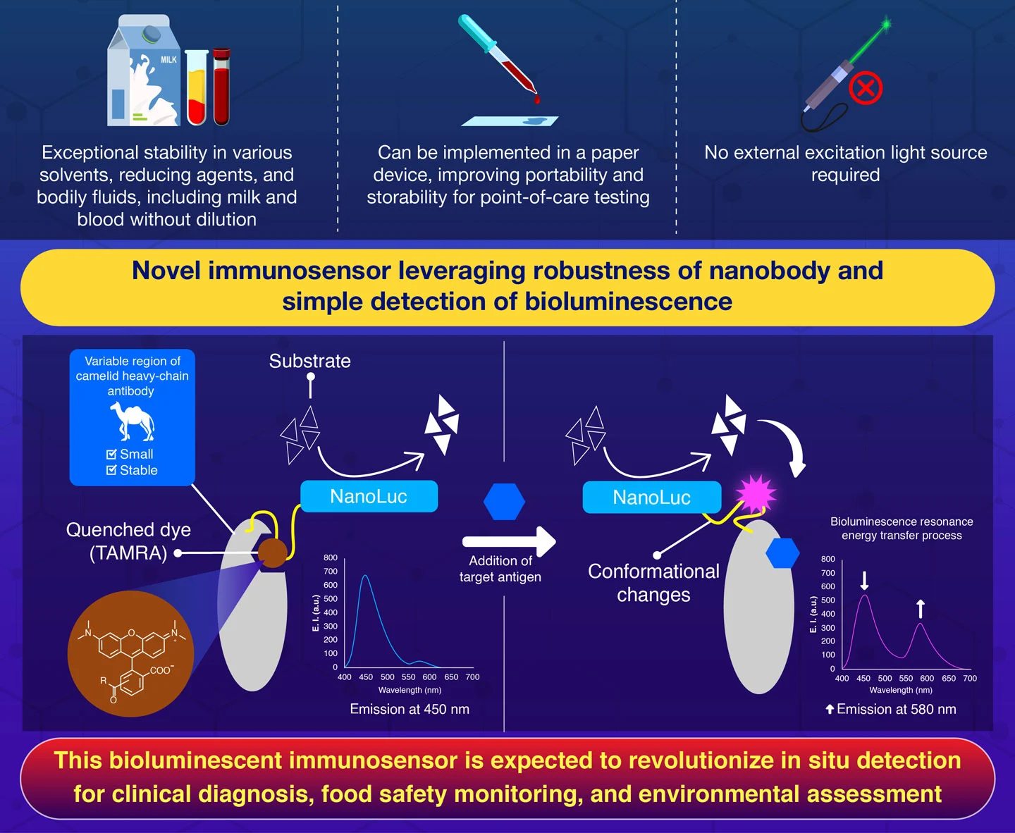 The researchers tested this new design through a series of experiments. "The proposed immunosensor, which we dubbed BRET nano Q-body, offers superior thermostability and endurance in organic solvents, reducing agents, and detergents due to the robust structure of the nanobody, and is equally suitable for use in biological fluids, such as milk, serum, and whole blood, without dilution, due to large emission ratio change derived from bioluminescence," remarks Kitaguchi.
