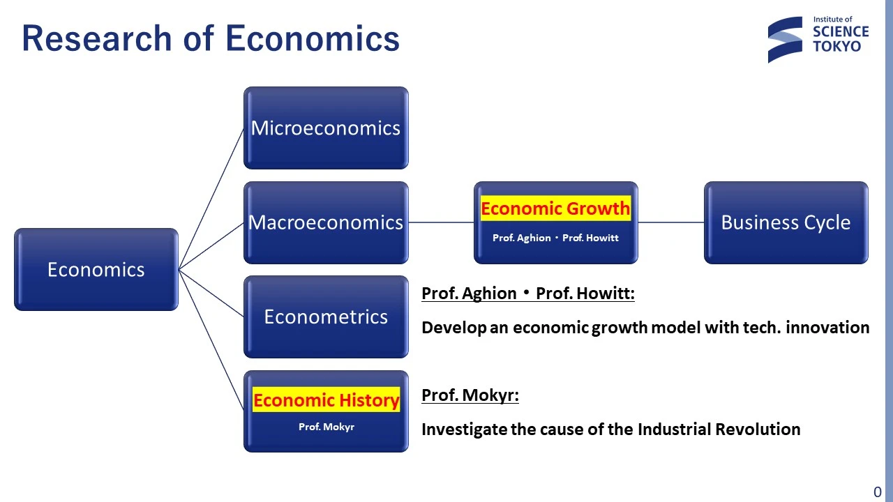 Morita The prize recognizes their contributions to uncovering the mechanisms through which technological innovation drives economic growth. Economics is typically divided into four fields: microeconomics, macroeconomics, econometrics, and economic history. Professor Mokyr is an economic historian. He was awarded the prize for his influential research that uses historical records and new data derived from them to explain why the Industrial Revolution—history’s greatest turning point in economic growth—occurred. In contrast, Professors Aghion and Howitt specialize in economic growth theory, a subfield of macroeconomics that analyzes long-term changes in output. They were recognized for constructing models that explain how technological innovation generates sustained economic growth.