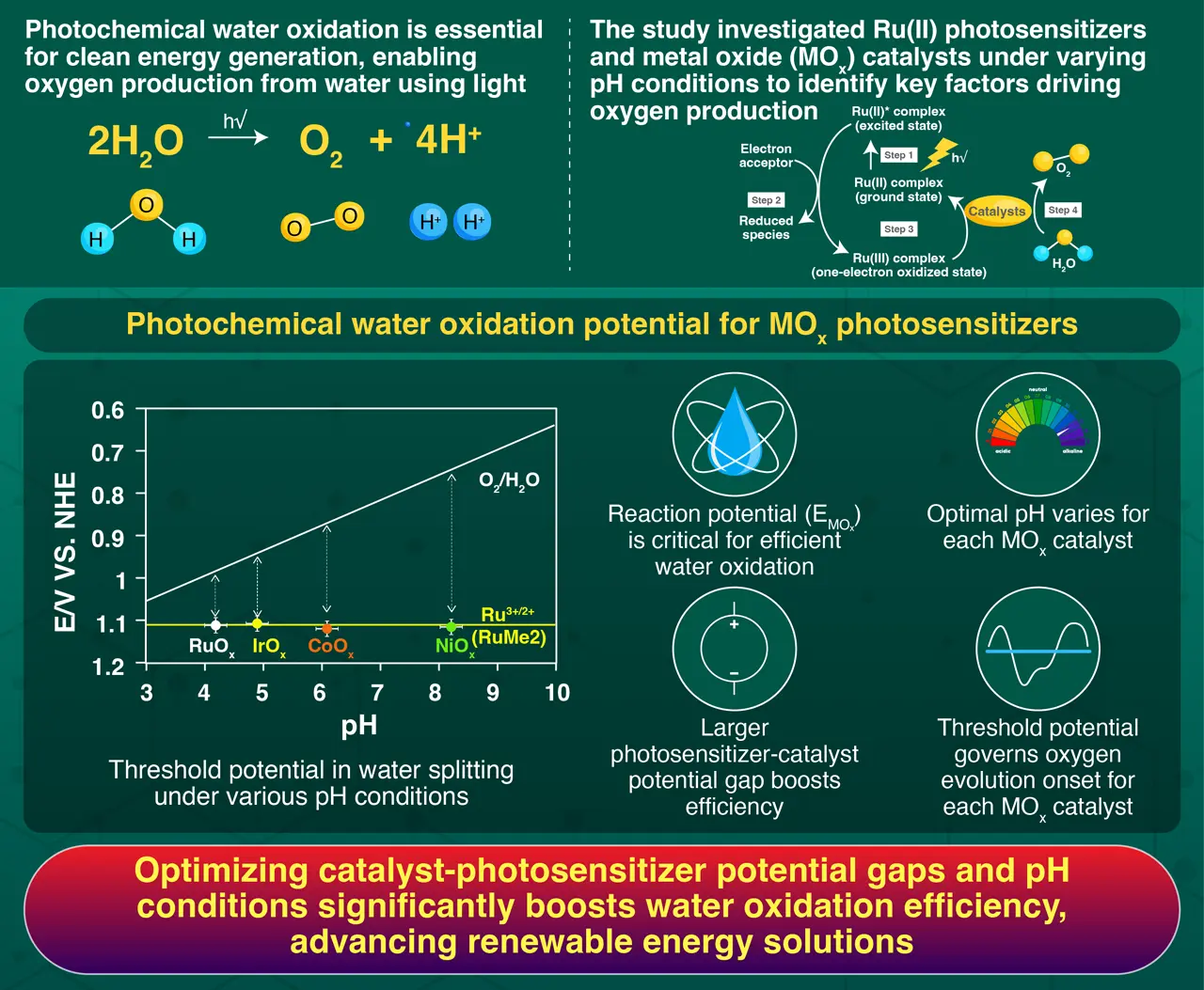 Water oxidation offers a promising path to achieve sustainable energy by efficiently generating oxygen. This study investigates how optimizing Ru(II) photosensitizers, metal oxide catalysts, and pH conditions can enhance water splitting efficiency. By introducing a simplified method to estimate catalyst performance, researchers make it easier to design more effective systems. These findings provide crucial insights for advancing clean energy solutions and accelerating the transition to renewable energy.