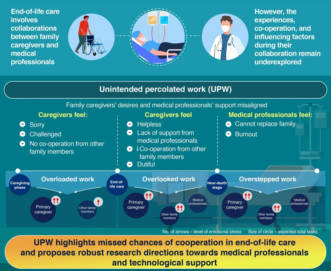 Overall, UPW—activities where stakeholders unintentionally exceeded their expected duties—shed light on collaborative opportunities between medical professionals and family caregivers, suggesting improved designs for medical professional and technological support to make end-of-life care easier.