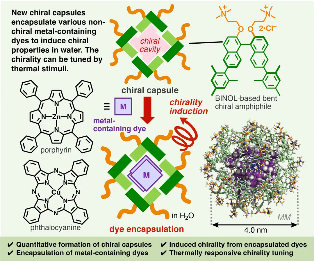 New molecular capsules capable of imparting chiral activity to non-chiral metal-containing dyes were successfully created by self-assembly in water, as reported by researchers from Japan. These capsules have adaptable chiral cavities, inducing chirality of various large and rigid metal-containing dyes upon encapsulation, without requiring typical chemical modification. Moreover, the chiral properties can be tuned with heat, showcasing the potential use in chiral materials and catalysts.