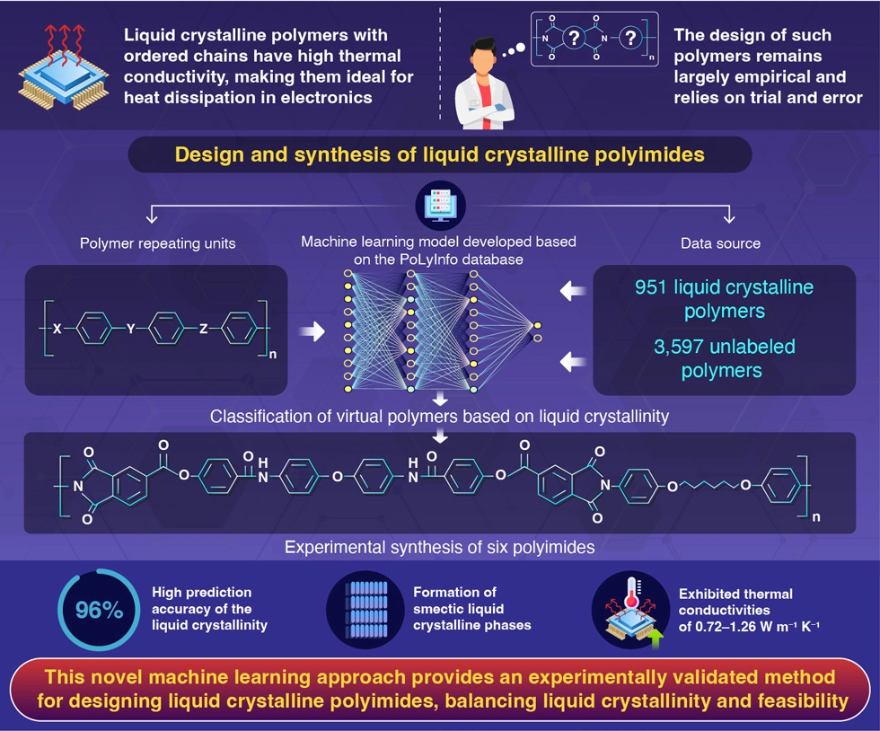 A machine learning method developed by researchers from Institute of Science Tokyo, the Institute of Statistical Mathematics, and other institutions accurately predicts liquid crystallinity of polymers with 96% accuracy. They screened over 115,000 polyimides and selected six candidates with a high probability of exhibiting liquid crystallinity. Upon successful synthesis and experimental analyses, these liquid crystalline polyimides demonstrated thermal conductivities up to 1.26 W m-1 K-1, accelerating the discovery of efficient thermal materials for next-generation electronics.