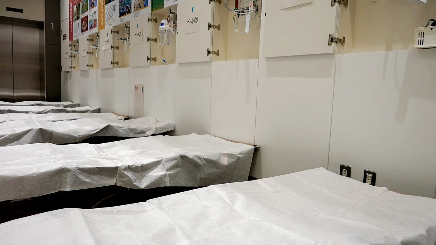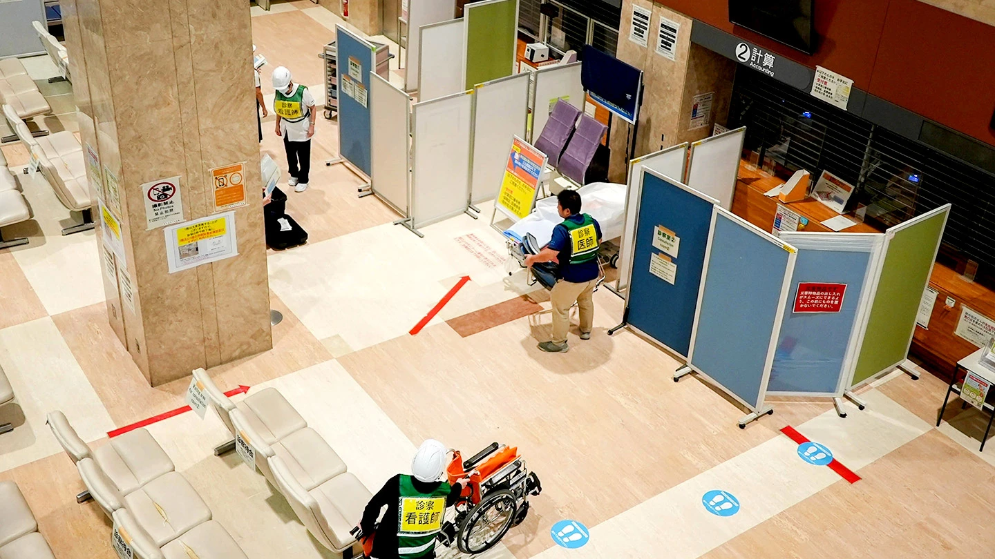 Following the occurrence of the simulated earthquake, a disaster response headquarters was established at the hospital. Damage reports were submitted from each floor. On the basement and first floor of Building C, triage areas, zones for receiving critically injured patients, and zones for treating minor injuries were set up. Medical gas outlets, emergency power outlets, and stretchers were arranged along the walls, and training for treating the injured was conducted.