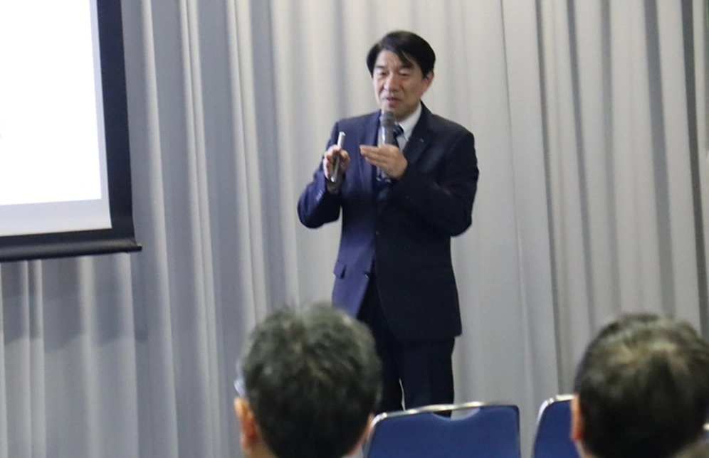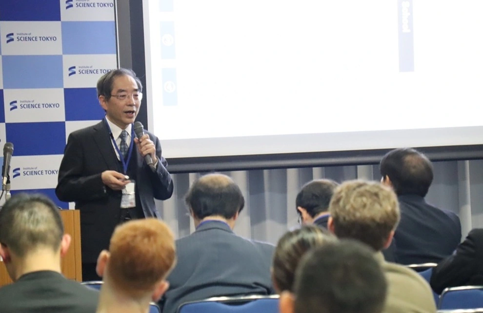 Following opening remarks by Patrick Foss, Vice President for International Strategy and Internationalization, Ohtake was joined by Yujiro Tanaka, President and Chief Academic Officer, to talk about “Building a Better, Brighter Future Together.” Their presentation saw them take turns explaining a wide range of topics. Starting with an overview of the Institute, they described its mission, the path to integration, and some of its recent international collaborative projects. They also highlighted the Visionary Initiatives (VIs), Science Tokyo’s new Institute-wide vision-driven integrated research framework.