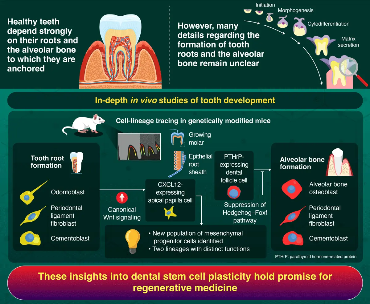 Two distinct stem cell lineages that drive tooth root and alveolar bone formation have been identified by researchers from Science Tokyo. Using genetically modified mice and lineage-tracing techniques, the team shed light on the cell signaling mechanisms guiding differentiation in stem cells in the developing teeth, offering key insights for future regenerative dental therapies.