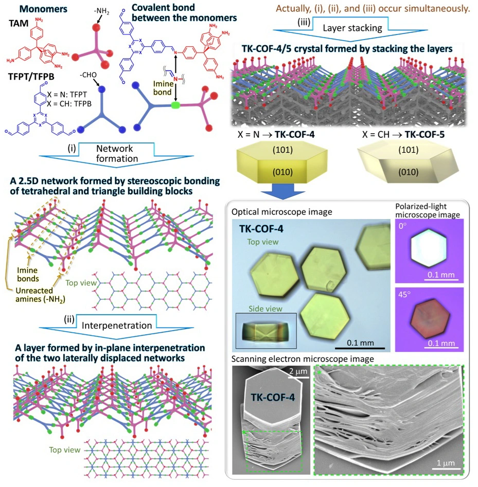 The organic porous materials recently reported by the researchers of Institute of Science Tokyo (Science Tokyo) have a slightly peculiar structure. Initially, the researchers were trying to polymerize two kinds of monomers, which are a tetrahedral molecule with four primary amines (-NH2) on the vertexes (TAM) and a triangle molecule with aldehydes (-CHO) on the vertexes (TFPT/TFPB), as shown in the upper left portion of Figure 1. Here, -NH2 and -CHO serve as “hands” to form a covalent bond; a “shaking-of-hands” between -NH2 and -CHO is known to form an imine bond (-HN=C-), a type of covalent bond, with a release of one H2O molecule. The researcher thought that they would obtain solids with granular shapes as a result of a three-dimensional (3D) network formation, as geometrically expected from the “four hands” of the tetrahedron monomer. In short, they planned to generate 3D covalent organic frameworks (3D-COFs).