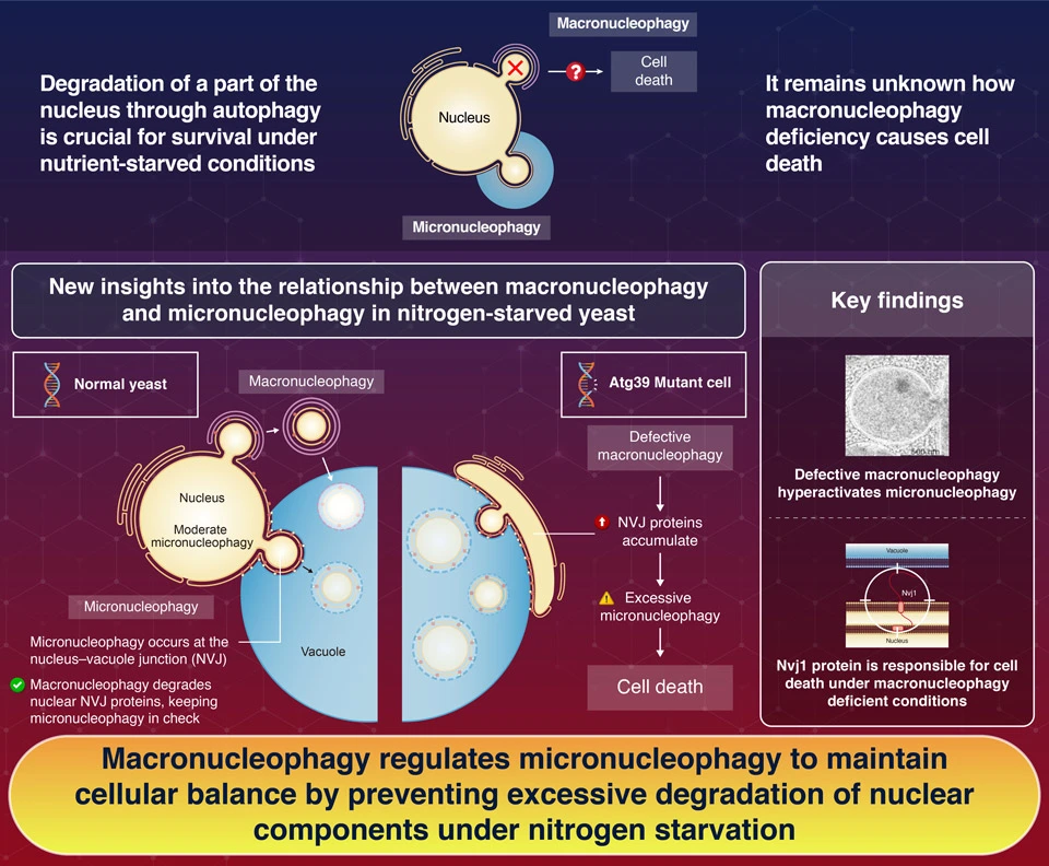 Macronucleophagy helps control micronucleophagy to protect yeast cells during stress. Through extensive experiments with yeast mutants, researchers from Science Tokyo found that disrupting macronucleophagy triggers excessive micronucleophagy, causing cell death. They further identified that this hyperactivation is driven by the accumulation of Nuclear vacuolar junction (Nvj1), a key nuclear membrane protein. These findings shed light on the links between different autophagy pathways under challenging conditions, which are crucial to maintain cell health.