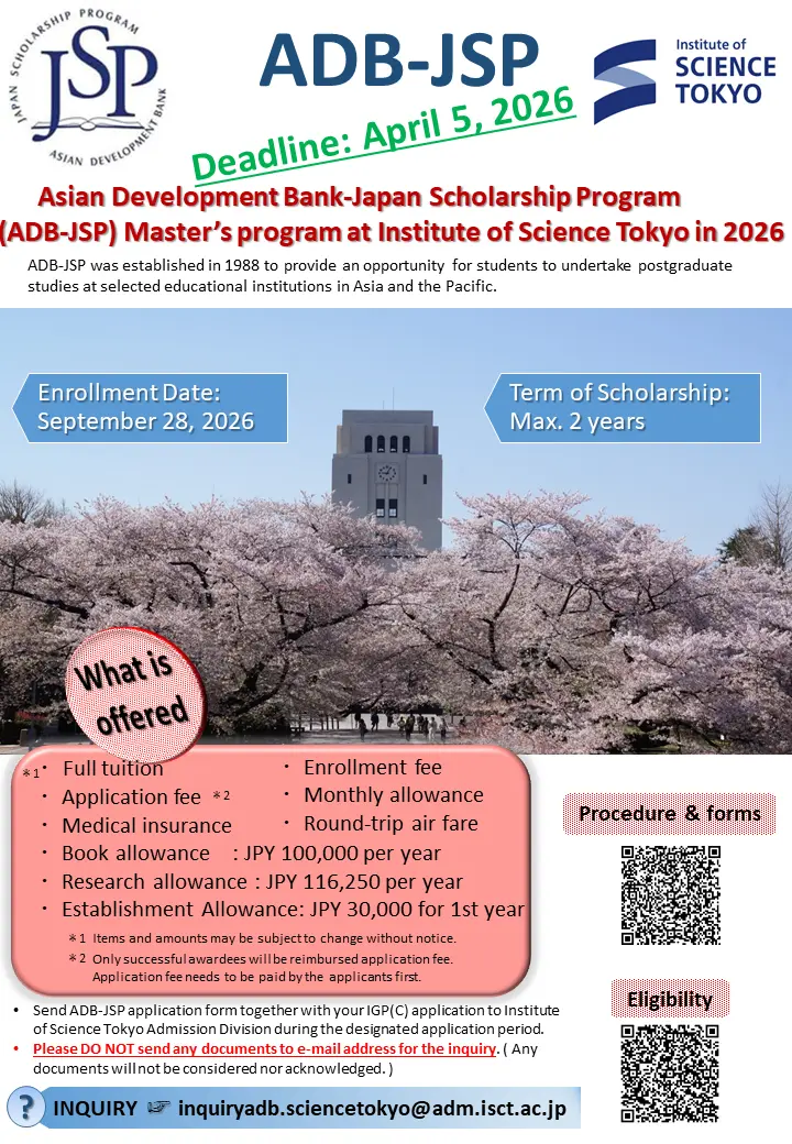 We are accepting applications to the master's degree program commencing in Fall 2026 under the "Asian Development Bank-Japan Scholarship Program (ADB-JSP)".