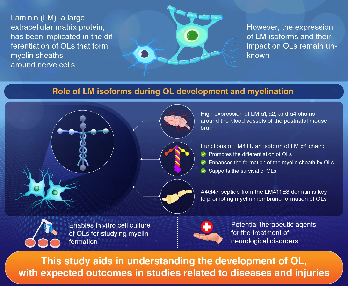 Finally, to identify the active region of the LM protein involved in myelination of OLs, the scientists focused on the E8 and E3 fragments. Their analyses revealed that the E8 fragment of the LM-411 protein was critical for myelin membrane formation. Contrastingly, the E3 fragments did not significantly influence the morphological differentiation of OLs. Furthermore, they identified A4G47 peptide—a short chain of amino acids derived from the LM-411E8 fragment—to be the main functional element that drives myelination by OLs.
