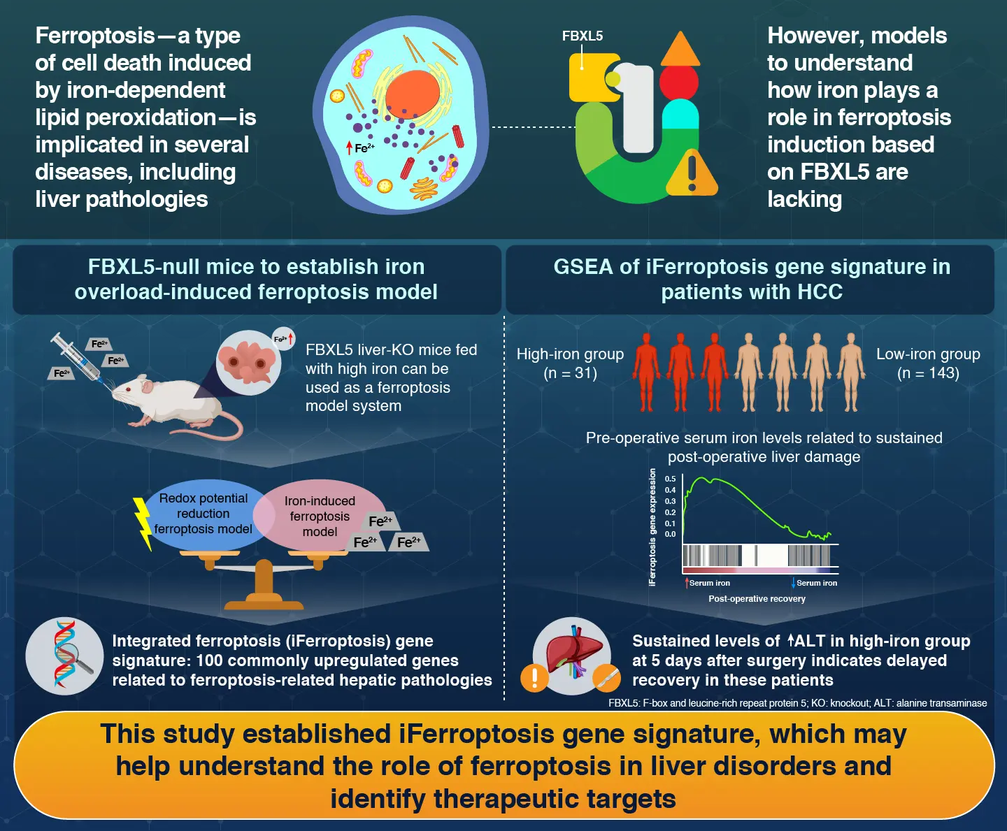 This study identified a gene signature characteristic of hepatic ferroptosis using mice models of iron overload-induced ferroptosis. Not only did the research team validate this gene signature in human and mouse liver injury models, but they also highlighted how high serum iron levels may predict delayed postoperative recovery in patients with liver disorders.