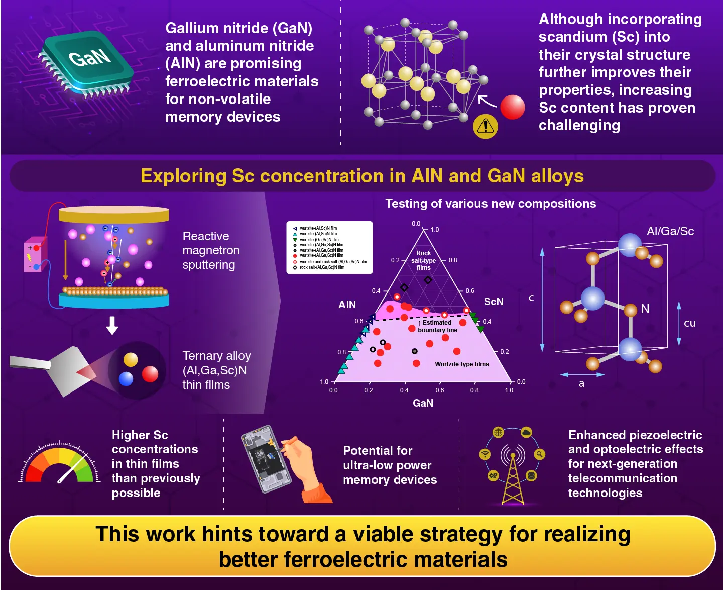 Gallium nitride (GaN) and aluminum nitride (AlN), materials already used in LEDs, possess unique crystal structures where positive and negative charge centers are naturally displaced. This displacement creates a switchable polarization that can be controlled by an applied external voltage, forming the foundation for non-volatile memory functionalities. Scientists know that incorporating scandium (Sc) into these crystal structures could significantly reduce operating voltages and enable ultra-low power operation. However, increasing the concentration of Sc has proven extremely challenging due to fundamental limitations in stability for both GaN and AlN.