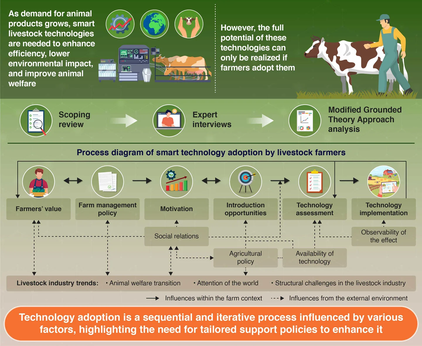 They were asked for their opinions on 20 factors influencing the adoption of smart livestock technologies. The factors were identified through a scoping review and covered various aspects, such as the farmer's background, knowledge of smart technologies, openness to try new products, views on the benefits and ease of use of the technology, financial resources, and the farming methods. The researchers then asked follow-up questions to understand the motivations, barriers, and external factors affecting farmer's decisions to adopt these technologies.