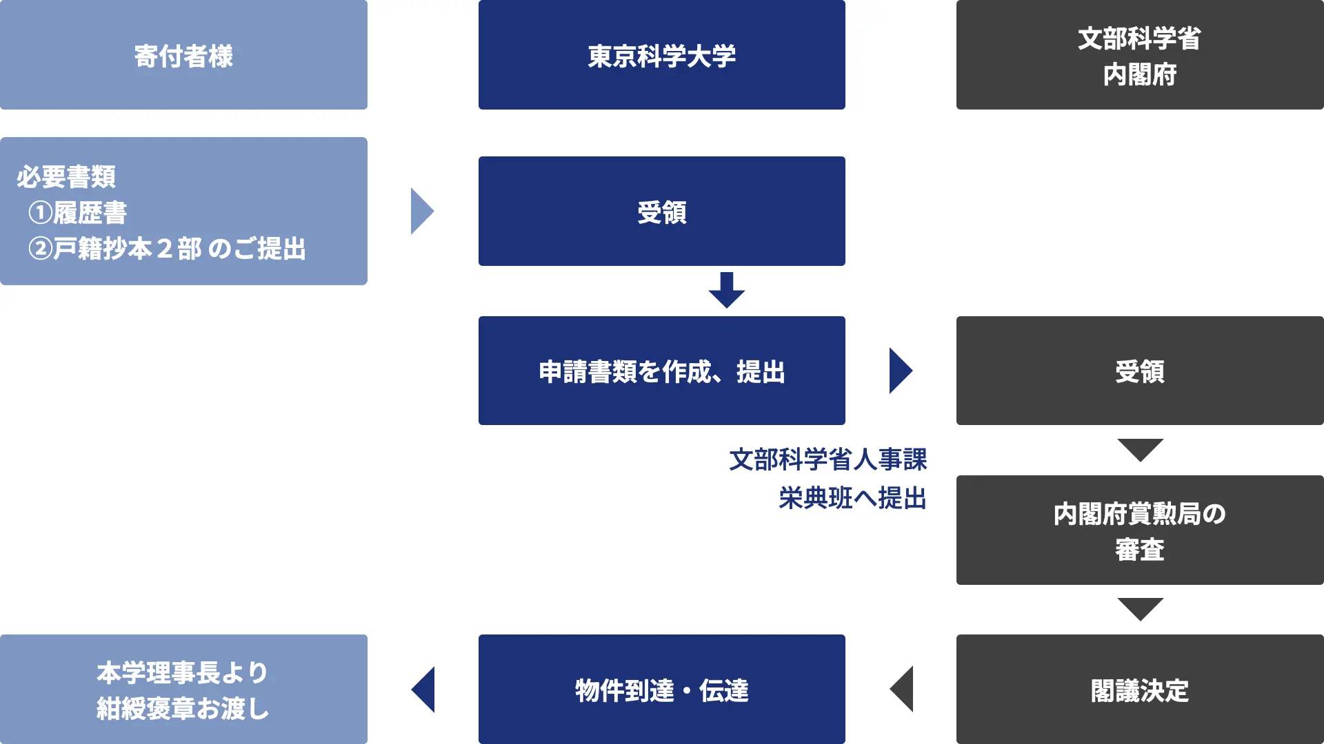 東京科学大学基金へご寄附をいただき、「紺綬褒章」の推薦要件に合致されている方については、受章されるご意思のご確認の後、本学から文部科学省(同省から内閣府へ)へご推薦をさせていただいております。