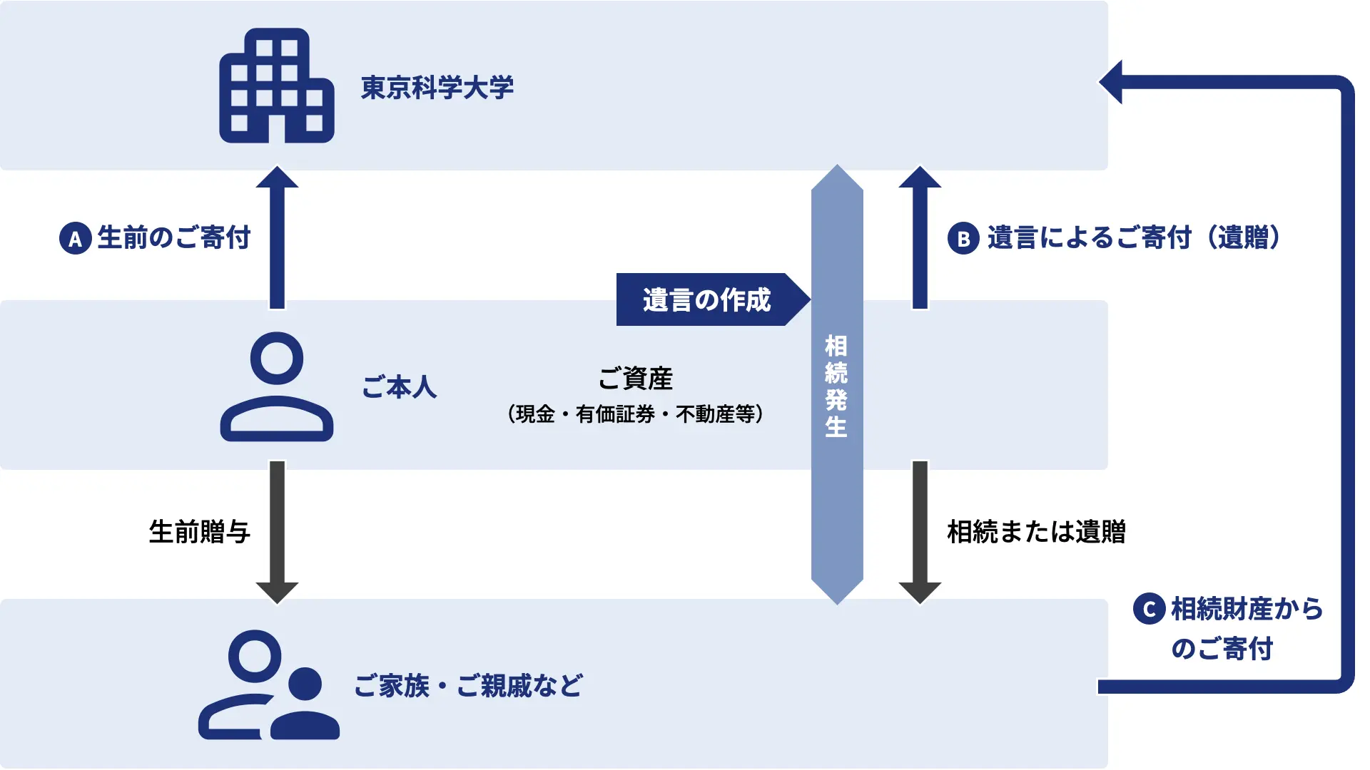 遺贈等の相続財産のご寄附には、ご寄附してくださる方や時期により、次の3通りの方法がございます。