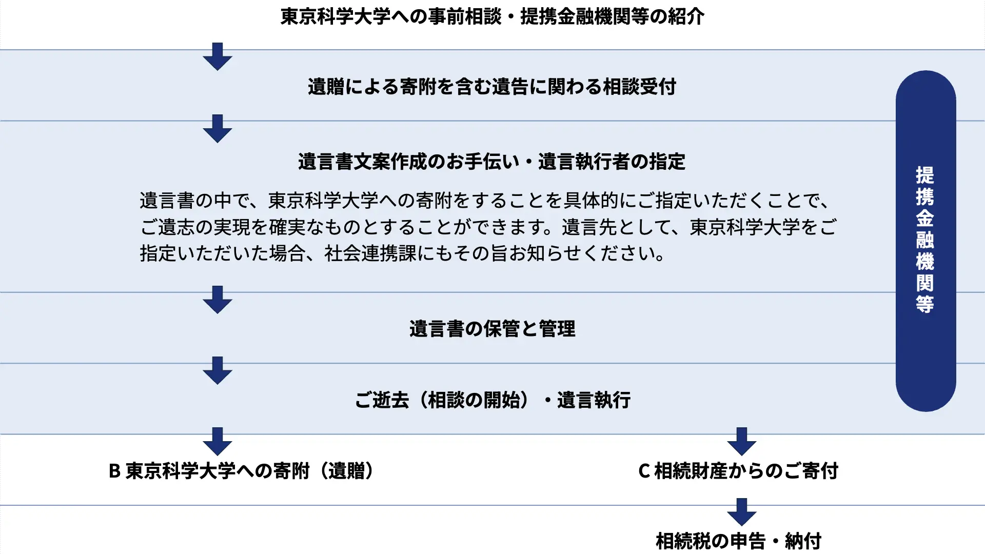 東京科学大学基金は、東京科学大学において、個人、法人・団体等の皆様からのご寄附の受入窓口として、学内組織の中に位置づけられております。本学への遺贈によるご寄附をお決めいただいた場合には、遺言書の中で遺贈先を「国立大学法人東京科学大学(所在地:東京都目黒区大岡山二丁目12番1号)」とご指定ください。