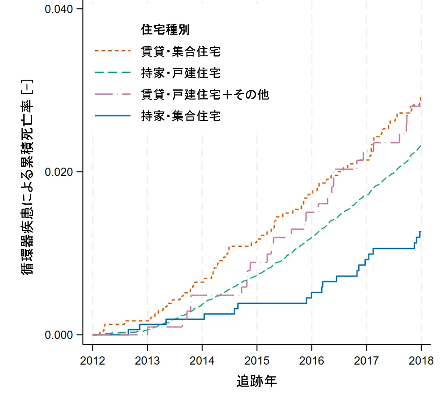 本研究では、38,731名の65歳以上の高齢者を対象に行われた2012年1月1日~2017年12月31日までの6年間の追跡調査のデータを用いました。住宅種別(持家・戸建住宅/持家・集合住宅/賃貸・戸建住宅/賃貸・集合住宅)に関するアンケート、市町村の保有する死亡日データ、厚生労働省の保有する死因データを結合し、循環器疾患に起因する累積死亡率を住宅種別に比較しました(図1)。その結果、持家・集合住宅(青実線)、持家・戸建住宅(緑点線)、賃貸・集合住宅(橙点線)の順に循環器疾患による累積死亡率が高くなり、カプラン・マイヤー曲線[用語3]の差を検定した結果、統計学的な有意差が認められました(賃貸・戸建はサンプル数が少ないため対象外)。