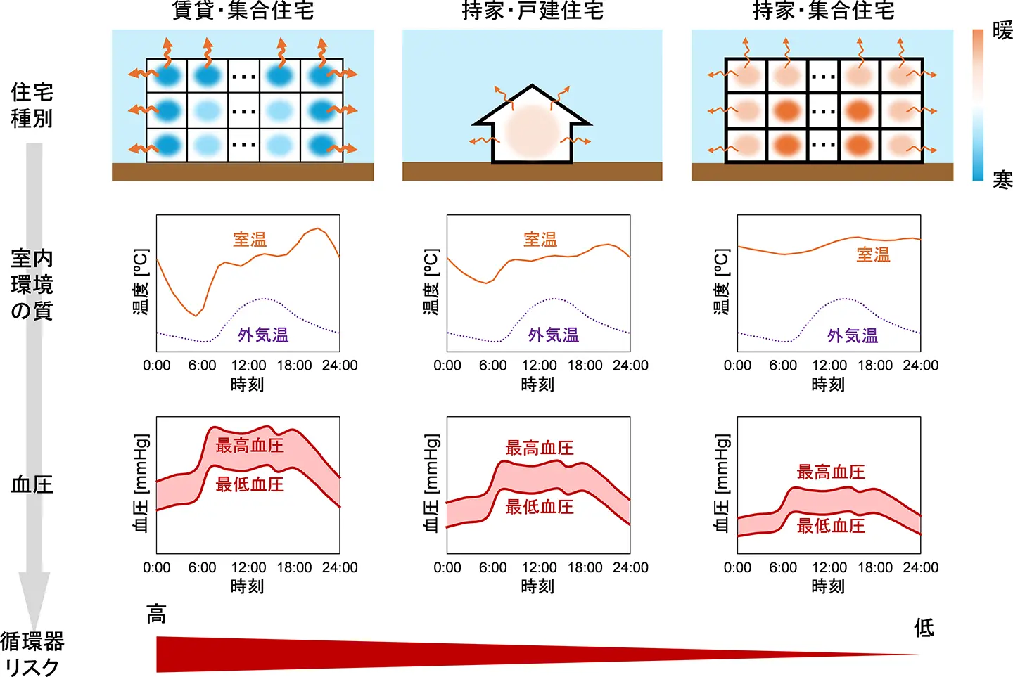 上記で得られた住宅種別による循環器疾患死亡の違いは、「賃貸と持家の住宅性能の差」や「戸建と集合の構造的な差」によって生じた可能性があります。前者に関連して、賃貸住宅のオーナーは自分自身がその住宅に居住しないため、住宅性能向上のための投資をせずに持家と比べて住宅性能が低くなる傾向にあるスプリット・インセンティブ[用語6]という問題があります。さらに上下左右を屋外に囲まれる戸建住宅は、上下左右を隣接住戸に囲まれる集合住宅と比べて、屋外と接する壁や屋根等の面積が大きいため、屋外環境の影響を受けやすくなります。そのため室内環境、中でも循環器疾患のリスク要因である温熱環境の質が低下しやすく、適切に管理されている集合住宅に比べ死亡リスクが高くなったものと考えられます(図2)。