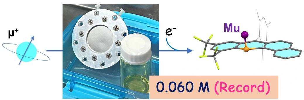 ミュオンと有機化合物の反応について、具体的な事例を図1に示します。この事例は筆者らが以前のプレスリリースで紹介したホスファアントラセンの素粒子ラジカル反応で、リン原子に位置選択的にミュオニウムが付加して1種類の常磁性分子が生成することをミュオンスピン回転・共鳴(µSR)測定実験と密度汎関数法(DFT)[用語2]計算によって、同定しました※。このとき、ホスファアントラセン構造を安定化するために導入したトリフルオロメチル(CF3)基が引き起こす分子ひずみがミュオンの同位体効果によって解消され、3個の環から成る分子は元々の平面構造を保った、高エネルギー状態となることが分かりました。また、この常磁性ミュオニウム付加体のµSR観測では、0.16 M(1 M = 1 mol/L)程度のホスファアントラセン溶液試料を用いて行っていますが、これよりも希薄濃度の試料を用いると常磁性ミュオニウム付加体は観測されなくなりました。一般的に有機分子の溶液試料を用いてµSRでミュオニウム付加体を観測する場合、0.5 M程度の濃度が望ましいとされているため、ホスファアントラセンのµSR測定で用いた溶液試料の濃度は比較的低かったと言えます。