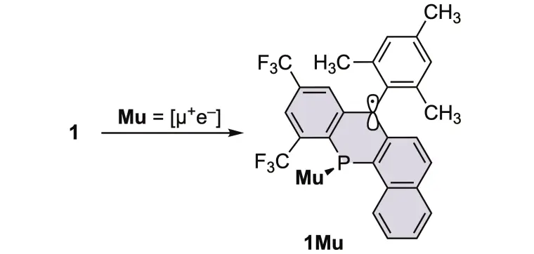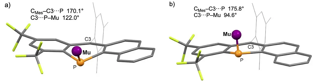 続いて、生成したミュオニウム付加体の構造を確実に同定するために、ミュオン準位交差共鳴(µLCR)測定[用語6]を行ったところ、図3bに示すスペクトルからわかるように0.75 T付近に一つの共鳴シグナルが現れました。これは分子中の31P核の超微細結合定数(128 MHz)に相当します。DFT計算の結果、図4に示す反応式のようにミュオニウムが1のリン原子に位置選択的に付加して1Muが生成しており、背景項で述べたホスファアントラセンのミュオニウム付加体と同様に、零点エネルギー[用語7]の上昇をもたらすミュオンの同位体効果が作用することで、融合(縮環)した4個の環が平面をなす準安定構造が形成されていることが同定されました(図5)。