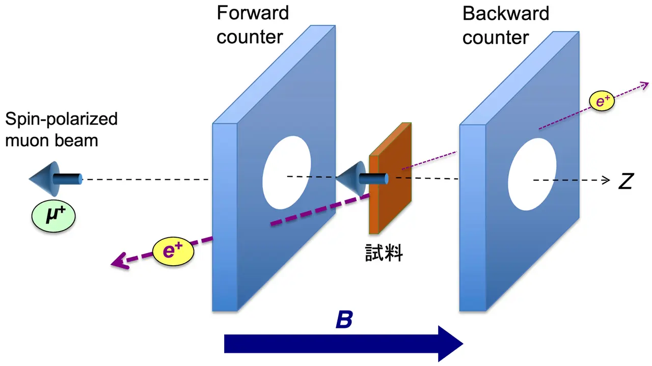 - ミュオンスピン回転・共鳴(µSR)測定実験:ミュオンの平均寿命は2.2マイクロ秒であるが、ミュオンが崩壊すると式1の反応によって陽電子(e+)と2種類のニュートリノ(ν)が生成する。ここで生成する陽電子を観測することで、元々完全にスピン偏極していたミュオンの変化が明らかとなり、物質の構造や性質を解析することができる。