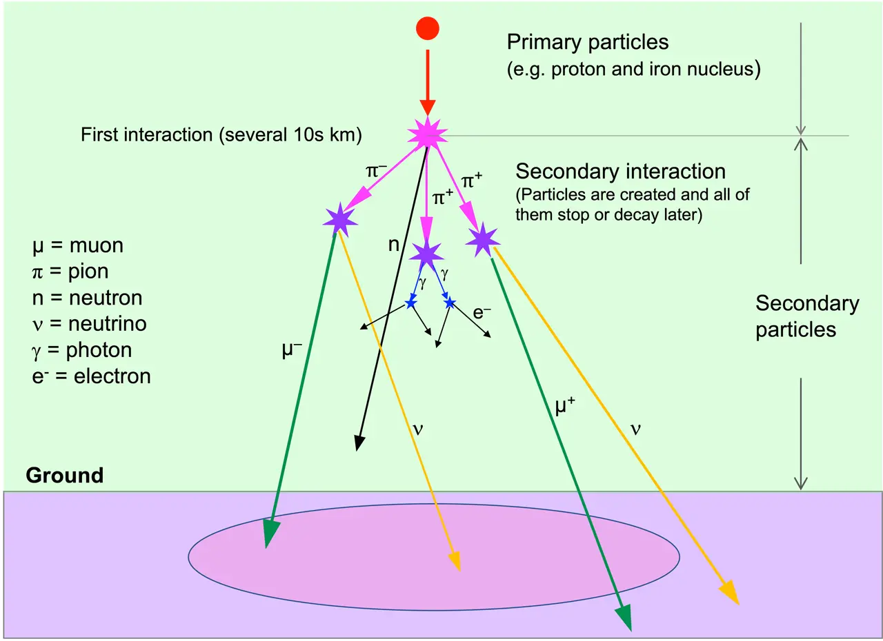 µSRでは加速器を使ってつくり出したミュオンビームを用いましたが、これは地球の上空でミュオンが生成している現象と同じ仕組みです(図6)。すなわち、地上には上空でつくり出されている宇宙線ミュオンが常に降り注いでおり、ピラミッドや原子炉などの巨大建造物や火山の透視技術に利用されています。宇宙線ミュオンは加速器からつくり出されるミュオンビームよりも極めて低密度なので物質材料研究にはこれまで使われてきませんでしたが、今回見出した知見をもとに素粒子ラジカル反応の更なる高効率化を図ることができれば、宇宙線ミュオンと分子の相互作用を利用した夢のような新しい科学技術の創成にも期待がかかります。