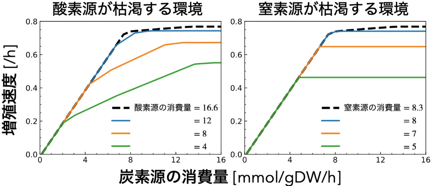 炭素源の消費量が増えるのに応じて増殖速度は上昇するが、酸素源(左)や窒素源(右)の供給が減少すると、より少ない炭素源消費量で増殖速度の伸びが鈍化し始める。この傾向は大腸菌の全代謝モデルを用いた数値計算で確認され、既存の実験結果とも整合的であることが確認された。mmol/gDW/hは、細胞の乾燥重量1グラムあたりの、1時間あたりのグルコース消費量(ミリモル数)を示す単位。