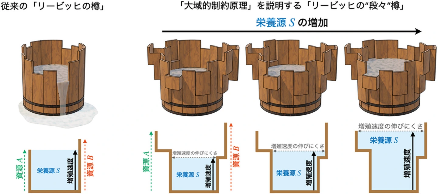 右:共同研究チームが提案する「大域的制約原理」を説明する「リービッヒの"段々"樽」。栄養源の消費が進み、他の資源の枯渇が制約として加わると、板が階段状に広がって水位が上昇しにくくなる。