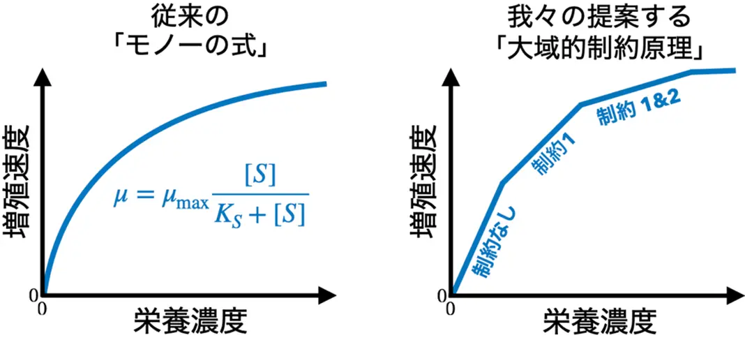 今回、共同研究チームは、この古くて大きな課題に挑み、モノーの式とリービッヒの最小律を統一的な枠組みで説明できる包括的理論を確立しようとしました。
