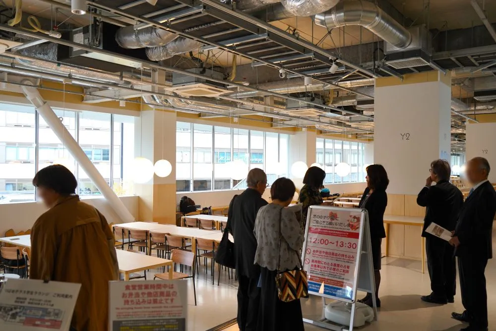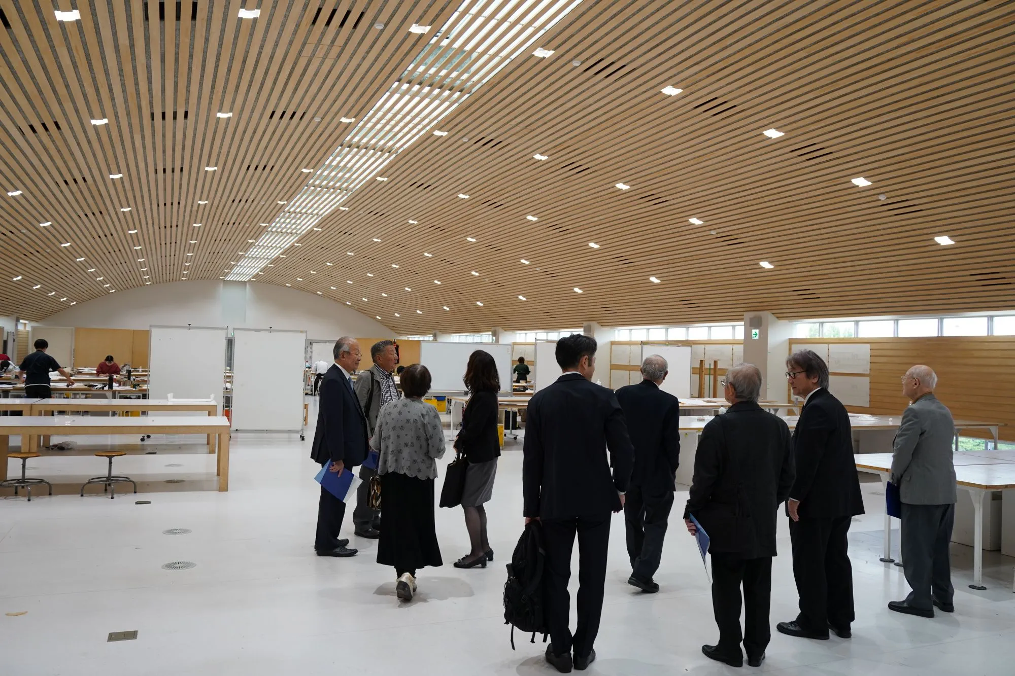 西5号館は、2023年に竣工した、環境・社会理工学院が管理する教育研究施設です。アーチ状の天井と天窓を有する広々とした建築学系の製図室や、地下の大規模な建築学系、土木・環境工学系の実験工場を見学いただき、さらに西5号館に設置されている食堂「つばめテラス」をご覧いただきました。