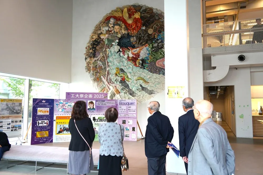 また、西5号館の他にも、附属図書館やHisao & Hiroko Taki Plazaを巡りました。Taki Plazaでは、パブリックアートや、学生交流支援基金寄附者銘板を見学いただきました。