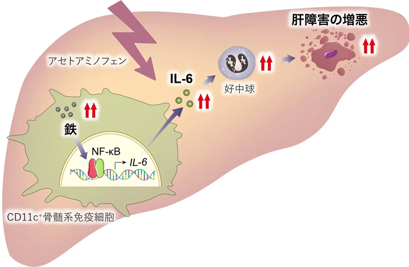 以上の結果から、CD11c+骨髄系細胞における鉄代謝の破綻が、IL-6発現と好中球動員を介して急性肝障害を悪化させることが示されました。