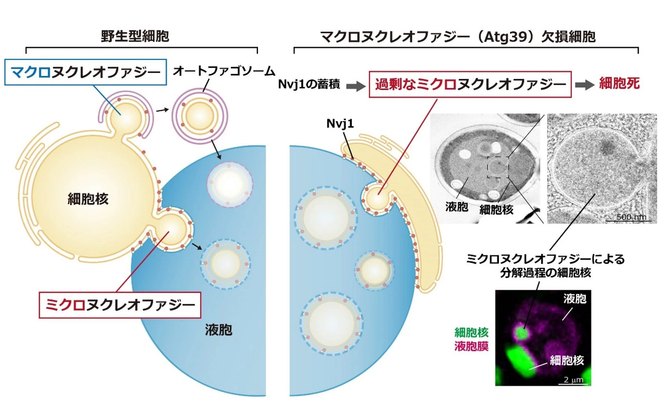 本研究では、マクロヌクレオファジーの停止がミクロヌクレオファジーの過剰亢進を引き起こすことを発見しました。さらに、ミクロヌクレオファジーによる過剰な核成分の分解が細胞死の主要な原因となっていることを明らかにしました。