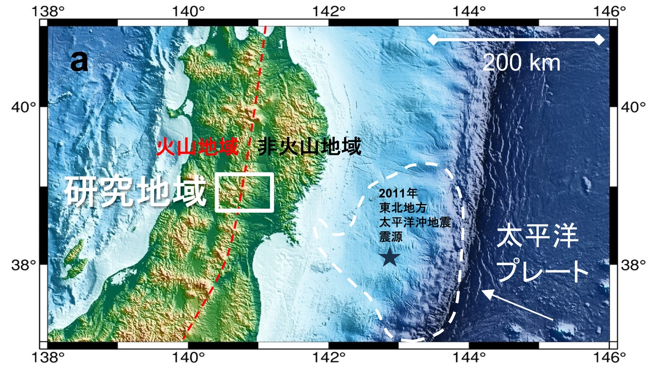 - 東北地方中央部の地下40㎞までの領域では、火山・非火山地域を問わずマグマが深部に広く分布すること、またそのマグマから水が放出され、高い流体圧により地震を誘起していることなど、マグマ―水―地震の関連性がはじめて具体的に明らかとなった。