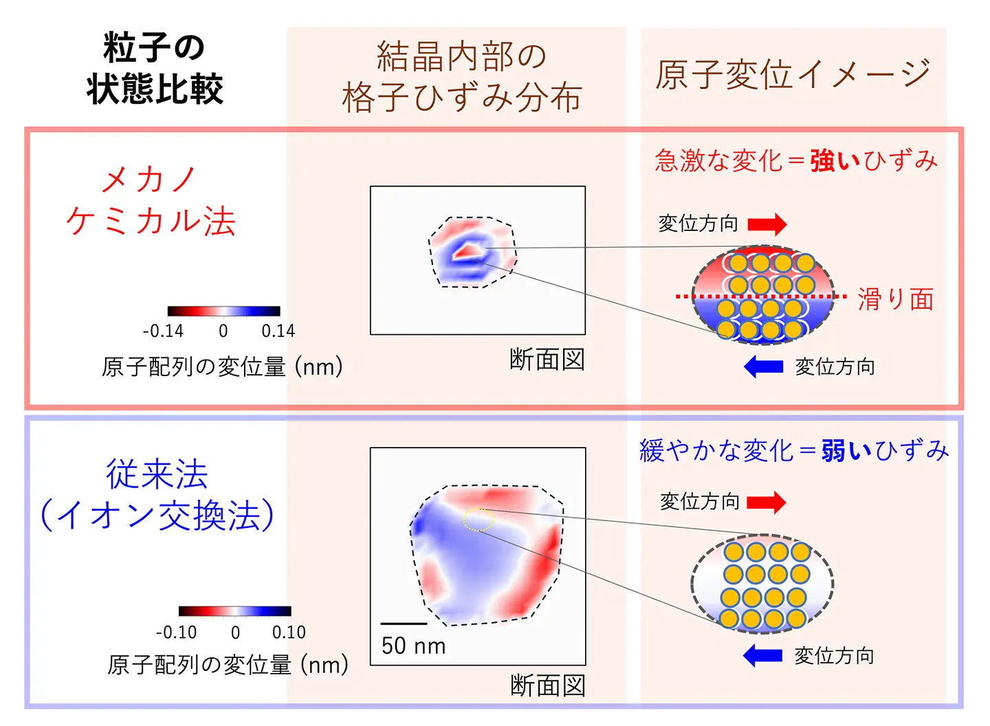 メカノケミカル法で得られた試料(上段)では、イオン交換法で得られたもの(下段)に比べて、原子変位の急激な変化、すなわち、強いひずみが発生している。