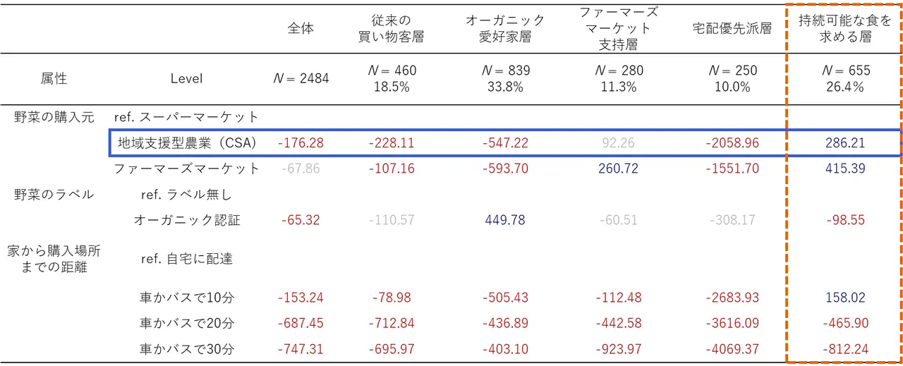 表1. 消費者セグメントごとの支払意思額(基準(ref.)と比較していくら高く支払っても良いか?)