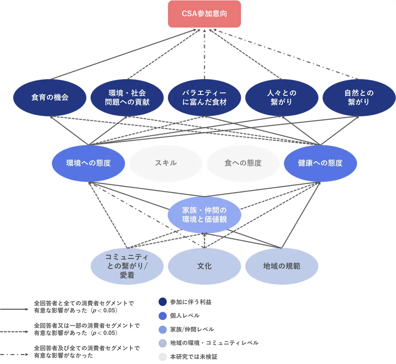 ショートフードサプライチェーン(Short food supply chain: SFSCs)[用語2]の一形態であるCSAは、消費者が生産者に事前に定額を支払うことで農作物を受け取るサブスクリプション契約型のシステムであり、低環境負荷な食料供給システムとして注目されています。しかし、日本におけるCSAの実践は限定的であり、CSAに参加しうる消費者像や、CSAに参加する際の意思決定に影響を与える要因の全体像や相互関係は明らかではありませんでした。