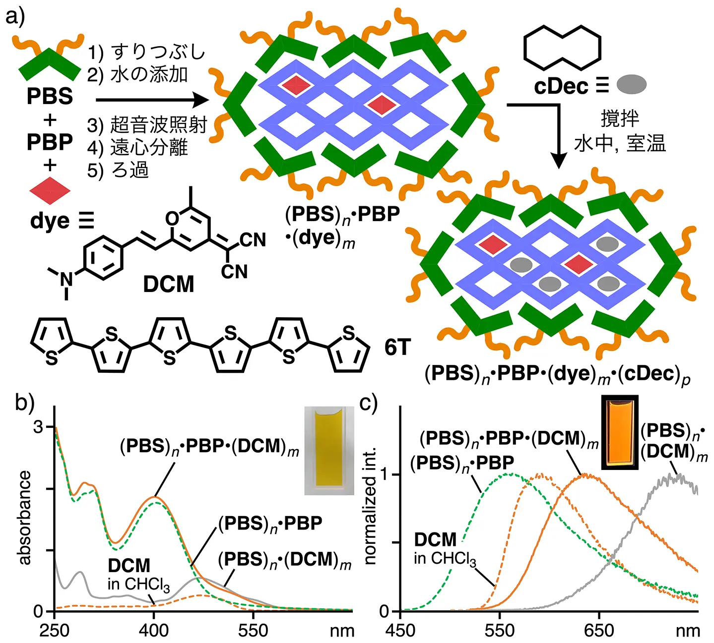 色素分子の捕捉については、まず、PBSとPBPと色素分子であるDCMの固体をよく混合した後、水を加えて、その懸濁溶液に超音波を照射しました。その後、得られた溶液を遠心分離とろ過することで、3成分複合体(PBS)n•PBP•(DCM)mの水溶液が得られました(図5a)。PBPの多空間による色素分子の捕捉は、DCMに由来する新たな吸収と蛍光バンドの観測から確認しました(図5b)。その蛍光バンドが、芳香環ミセルにDCMが直接捕捉された(PBS)n•(DCM)mと比較して、大きくシフトしたことから、多空間内でDCMの凝集が抑制されていることが分かります(図5c)。興味深いことに、この3成分複合体の水溶液にcDecを添加して撹拌することで、前例のない4成分複合体(PBS)n•PBP•(DCM)m•(cDec)pが得られました(図5a)。多空間ポリマー内にDCMとcDecが一緒に捕捉されることで、捕捉された色素に由来する蛍光性が8倍以上に増加しました。難溶性の色素分子(オリゴチオフェン:6T)を用いた場合も同様に、4成分複合体の形成で蛍光性能の向上を達成しました。内包による多空間ポリマーの水溶化で、種類の異なる複数の分子の捕捉にも成功しました。