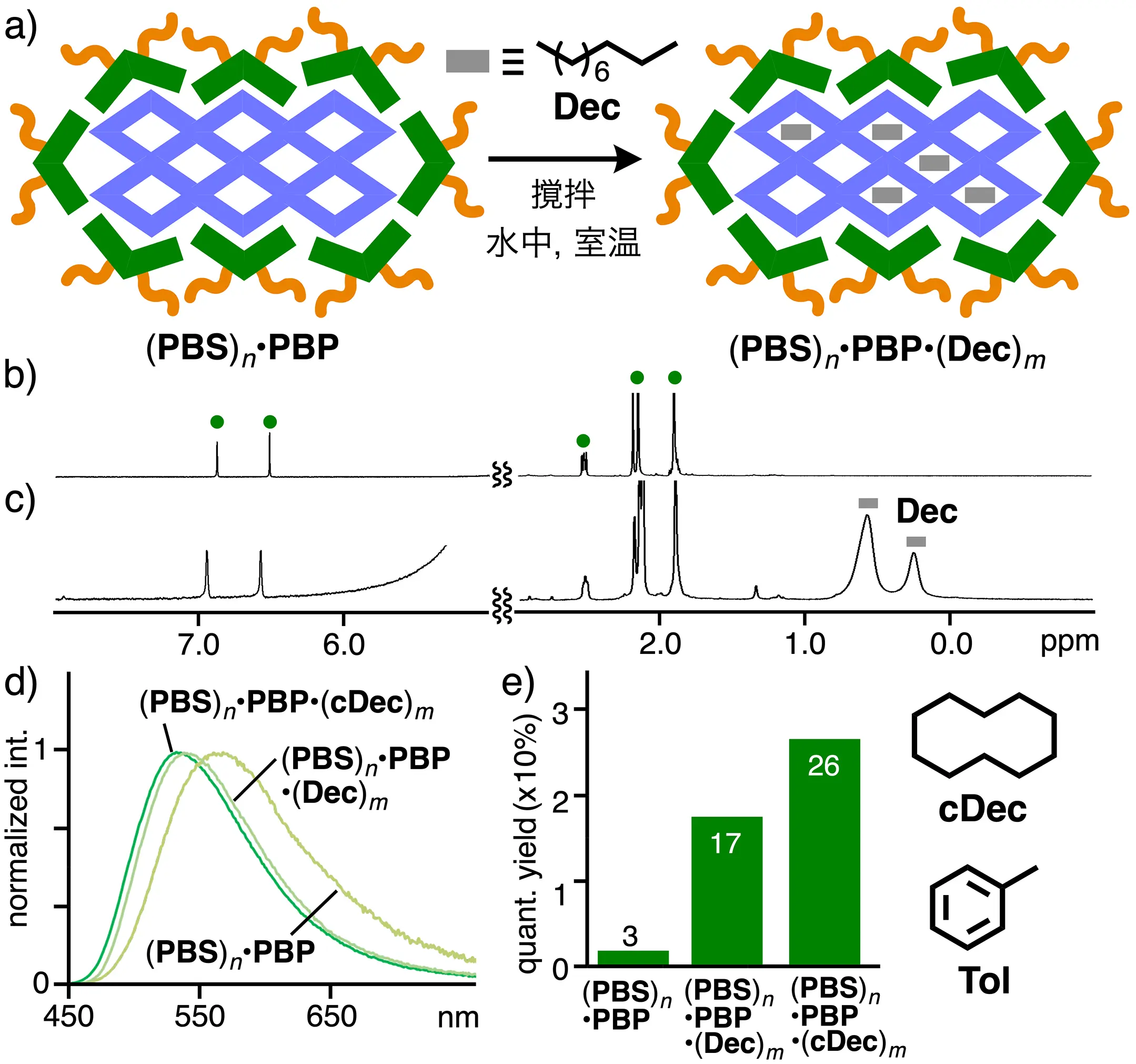 上記で作製した内包ポリマーの芳香環多空間には、水中においてアルカンや色素分子が大量に捕捉できることを明らかにしました。また、色素分子とアルカンを順に捕捉させることで、ポリマーとミセルを含めた合計4成分からなる超巨大複合体の作製にも成功し、多空間材料の新たな機能を開拓しました。まず、(PBS)n•PBPの水溶液に直鎖状アルカンDecを加え、室温で撹拌することで、3成分複合体(PBS)n•PBP•(Dec)mが得られました(図4a)。内包されたPBPの多空間に大量のDecが捕捉されたことは、核磁気共鳴装置(1H NMR)での新たなシグナルの観測(図4b、c)と多空間ポリマーに由来する蛍光バンドのシフト(図4d)から確認しました。捕捉されたDecの量はシグナルの面積から、純水中のDecの溶解量と比べて16,000倍以上に増加したことが分かりました。同様の方法で、環状アルカンcDecも効率良く捕捉され、それによる芳香環同士の相互作用の抑制で、多空間ポリマーの蛍光性は最大で約9倍に増加しました(図4d、e)。また、アルカンDecと芳香族分子Tolの混合物に対して、(PBS)n•PBPは水中で前者を優先的に捕捉しました。以上の結果から、溶液中での球状多空間ポリマーの分子捕捉能が初めて明らかになりました。