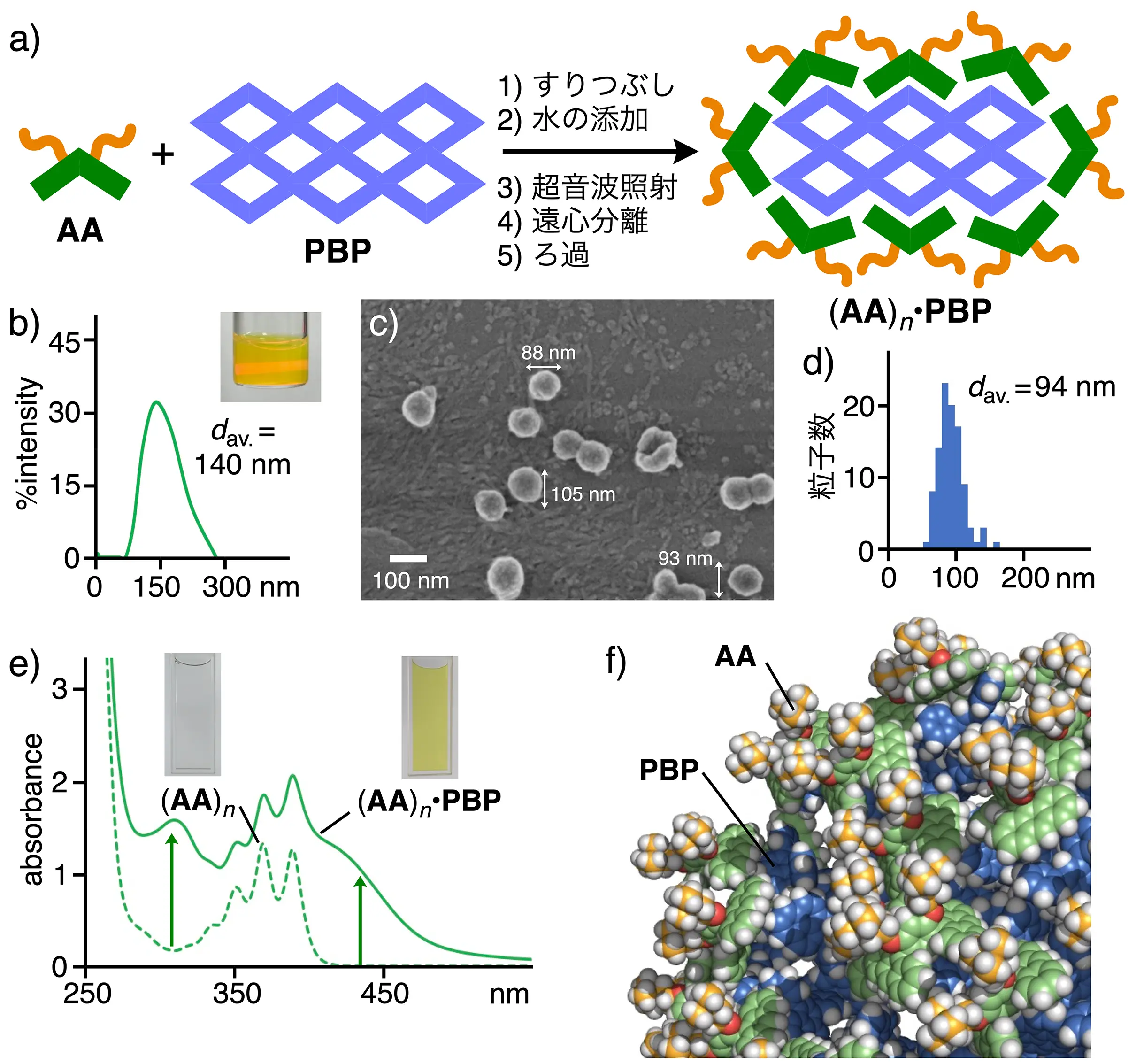 芳香環ミセルによる球状多空間ポリマーの水溶化は、湾曲型両親媒性分子AAによってPBPをカプセル化することで達成しました。この手法は簡便で、まず、AAとPBPの固体を乳棒と乳鉢でよく混合した後、水を加えて、その懸濁溶液に超音波を照射しました。その後、得られた溶液を遠心分離とろ過することで、内包ポリマー(AA)n•PBPの黄色の水溶液が得られました(図2a)。超巨大材料の可溶化は、チンダル現象や新たな吸収バンドの観測で確認しました(図2e)。そのサイズと形は、動的光散乱法(DLS;図2b)および高解像度顕微鏡(FE-SEM)による直接観察(図2c、d)で、約100 nmの球形と確認しました。本来、PBPのような固体材料は強く凝集しているので、水中で単一粒子の状態で観測されたことは、特筆すべき挙動です。その理由として、内包ポリマーの分子モデリングにより、多数のAAの芳香環骨格がPBPの芳香環表面と効果的に相互作用することで、カプセル化と水溶化が起こっていることが示唆されました(図2f)。
