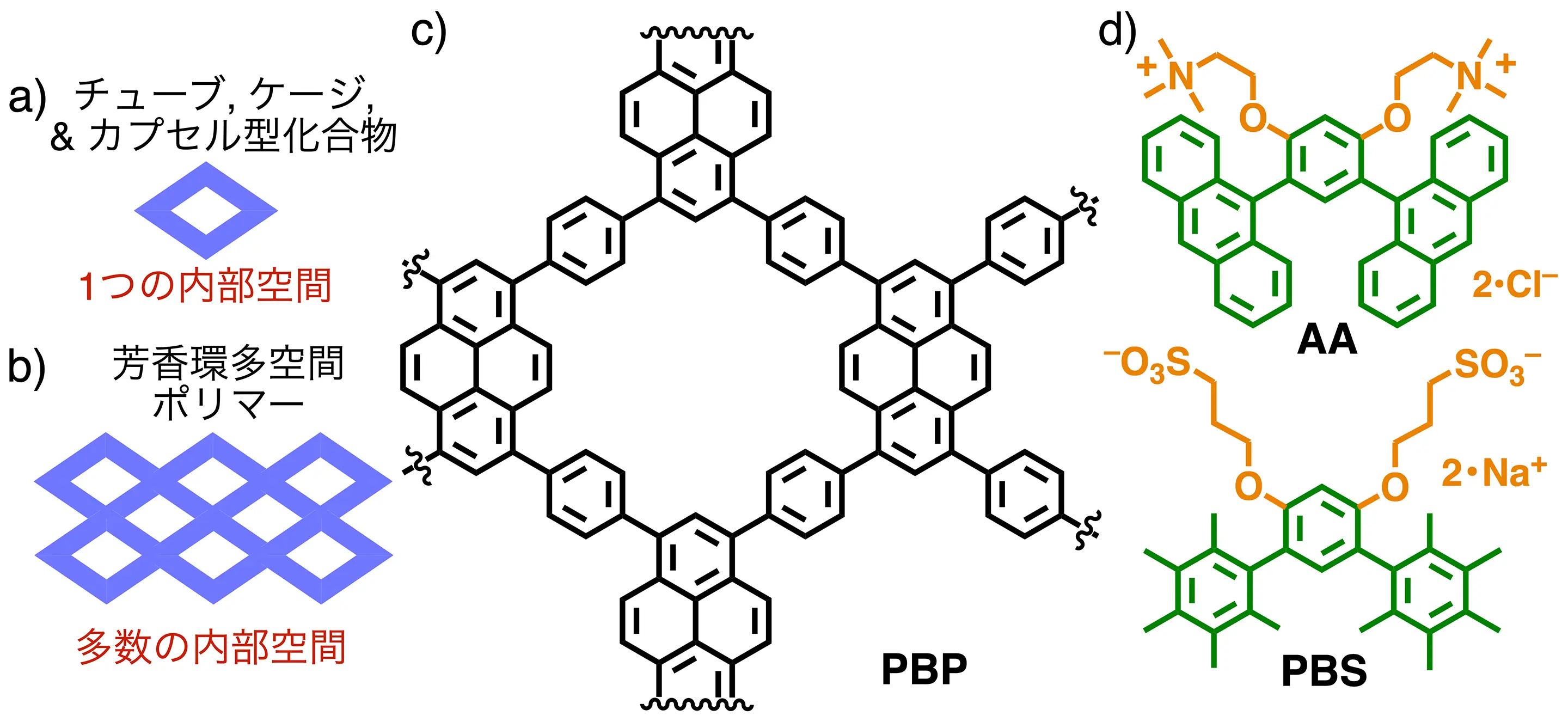 クラウンエーテルやシクロデキストリンが報告されて以来、チューブやケージ、カプセル型の化合物(図1a)が数多く開発されてきました[参考文献1]。これらの化合物の特徴は、一つの内部空間を持ち、溶液中で分子間相互作用[用語4]が働くことで、イオンや分子を捕捉できることです。これらの捕捉能は種々の分析方法で詳細に解明されています。一方で、多数の内部空間を持つ固体材料の捕捉能も注目されていますが、未解明な部分が多く残されています。その中でも芳香族化合物[用語5]を三次元的に連結した多空間ポリマー(図1b)は、合成が簡便で高い安定性を有し、多数の細孔を持つことからガス吸着・分離材料として盛んに研究されています[参考文献2]。しかし、それらはどのような溶媒にも不溶なため、固体状態での分析および活用に限られていました。本研究では、このような芳香環多空間ポリマーを内包により簡便に水溶化するとともに、その溶液状態での空間機能の開拓を目指しました。実際に、ピレン環とベンゼン環を交互に連結した多空間ポリマーPBP(図1c)とその誘導体を用いて実験を行いました[参考文献3]。これらの固体材料は約100 nmサイズの比較的剛直な球状構造体を持つため、これまでに可溶化の方法は報告されていませんでした。