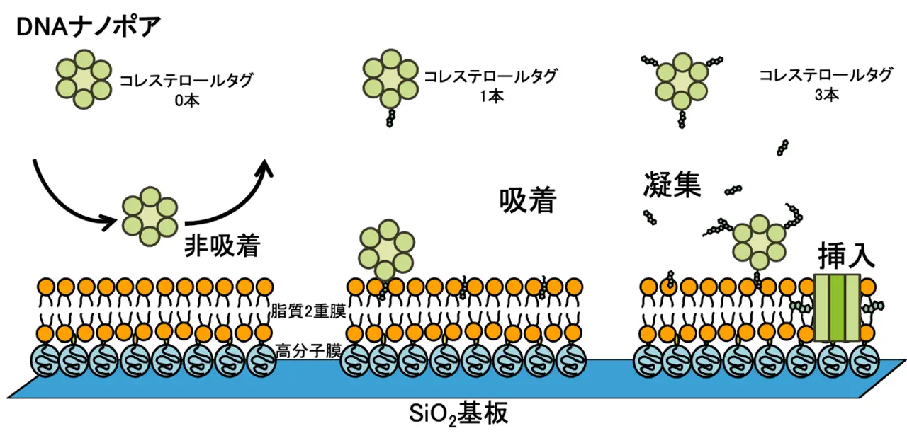 - DNAナノポアをコレステロールで修飾したり、支持基板を高分子で被覆したりすることによって、DNAナノポアと脂質二重膜の相互作用の精密制御が可能となった。