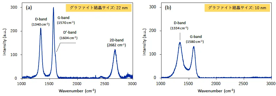 図4(a)は図3(b)に示したコイル状カーボンブラックのラマン散乱スペクトルです。グラファイト構造を示すG-bandピークが明瞭に観察され、グラファイトが層状になっていることを示唆する2D-bandピークも確認できます。図4(b)は高電気伝導性グラファイト(ファーネスブラック)として入手可能なカーボンブラックのラマン散乱スペクトルで、比較のため同じ分析装置、分析条件で解析しました。ファーネスブラックにおいては、グラファイト構造の欠陥を示すD-bandピークはG-bandピークよりも大きく、グラファイト結晶サイズはコイル状カーボンブラックより小さいことが示唆されます。また、2D-bandピークが非常に小さいことからグラファイトの層状構造が形成されていないことが示唆されます。すなわち、ファーネスブラックのグラファイト結晶性はプラズマ触媒で合成したものより低いことがわかります。さらに、コイル状カーボンブラックおよびファーネスブラックを用いてリチウムイオン電池の電極を作成し充放電特性を評価した結果、コイル状カーボンブラックの方が高い性能を示しました。グラファイト結晶性が高いことに加え、繊維状構造が電荷の輸送経路を形成しやすいことも要因と考えられます。