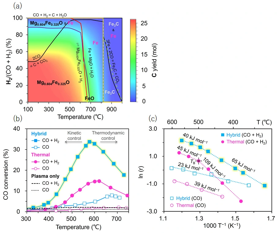 カーボンブラックが生成されやすい条件を調べるため、熱平衡計算に基づき炭素(C)、酸素(O)、水素(H)、鉄(Fe)、マグネシウム(Mg)の相図を作成しました。マグネシウムは鉄触媒を保持する担体として利用します。図1(a)の赤色で示された領域(100〜500℃)はカーボンブラックが生成されやすい条件を示しています。実際に、さまざまな条件(温度、プラズマ印加・水素添加の有無)でカーボンブラック合成を試みたところ、触媒の温度が高すぎても低すぎてもカーボンブラックは生成されず、約600℃(プラズマ印加・水素添加あり)で最も高いカーボンブラックの収率を示しました(図1(b))。気体分子に内部エネルギーを与えることで活性化エネルギーが熱反応の109 kJ/molからプラズマ反応の65 kJ/molに低下し、約600℃で20~30 gC/gFe/hのカーボンブラックを合成できます(図1(c))。600℃の領域では、鉄(Fe)は酸化物(例えばFe-Mg-O、Fe3O4など)として安定に存在するため、触媒機能を発現しづらいと考えられます。しかしプラズマを印加すると、励起された気体分子が鉄酸化物の一部を鉄に還元し、活性サイトを形成することで平衡論的に有利な低温領域でのカーボンブラック生成に寄与したと考えられます。すなわち、プラズマの役割はCOを励起して直接的にC≡O結合を切るのではなく、低温で鉄酸化物を部分的に還元することだと示唆されました。また、H2を微量添加(COに対して約10%)してプラズマを作用させると、CO転換率は最大で約6倍向上しました(図1(b):600℃付近での■と□を比較)。これはプラズマで励起された水素が高い触媒還元能を有するためで、反応機構に関する本研究グループの仮説を支持しています。水素は酸化鉄を還元する過程でH2Oになり消費されますが、水性シフト反応(H2O+CO=H2+CO2)によって容易に再生されます。そのため、プラズマとともに微量添加したH2は化学反応を顕著に促進しつつ、H2消費量はわずか3.5%にとどまります。