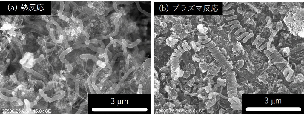 熱反応で合成したカーボンブラックは繊維状の構造を示しますが、プラズマを作用させるとコイル状に湾曲したカーボンブラックが選択的に生成されることも分かりました(図3)。プラズマによって成長速度が速くなると、カーボンブラックと触媒の界面で引っ張り・圧縮などの応力が不均衡に発生するため湾曲すると考えられます。湾曲構造によって比表面積が増大する、母材との接着強度が増すなどの効果が発現すれば用途開発において波及効果が期待されます。