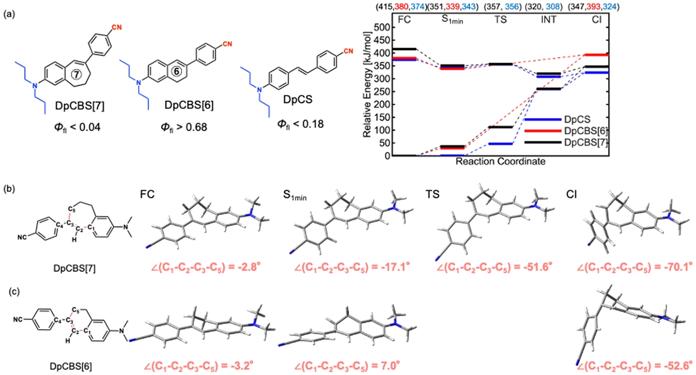 (a)7員環橋かけ分子(DpCBS[7])、6員環橋かけ分子(DpCBS[6])、および橋かけ構造を持たない分子(DpCS)の分子構造、溶液中における蛍光量子収率(Φfl)、ならびに量子化学計算により得られた励起状態から円錐交差(CI)に至るエネルギーダイアグラム。DpCBS[6]ではCIがエネルギー的に高く、励起状態から到達しにくいため溶液中で発光する。