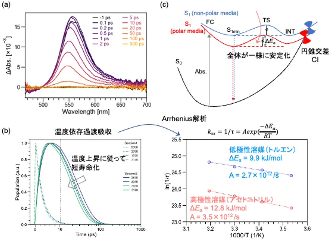 次に、この分子の励起状態のダイナミクスを明らかにするため、フェムト秒時間分解過渡吸収測定[用語5]を行いました(図2a)。その結果、DpCBS[7]は溶媒の種類によらず、励起後わずか数十ピコ秒でエネルギーを失うことが分かり、溶液中では超高速な無輻射失活が支配的であることが明らかになりました。さらに温度を変えて解析したところ、失活の速さはエネルギー障壁(ΔEa)の変化よりも、分子が無輻射失活経路に到達する"頻度"の違いによるものと判明しました(図2b)。
