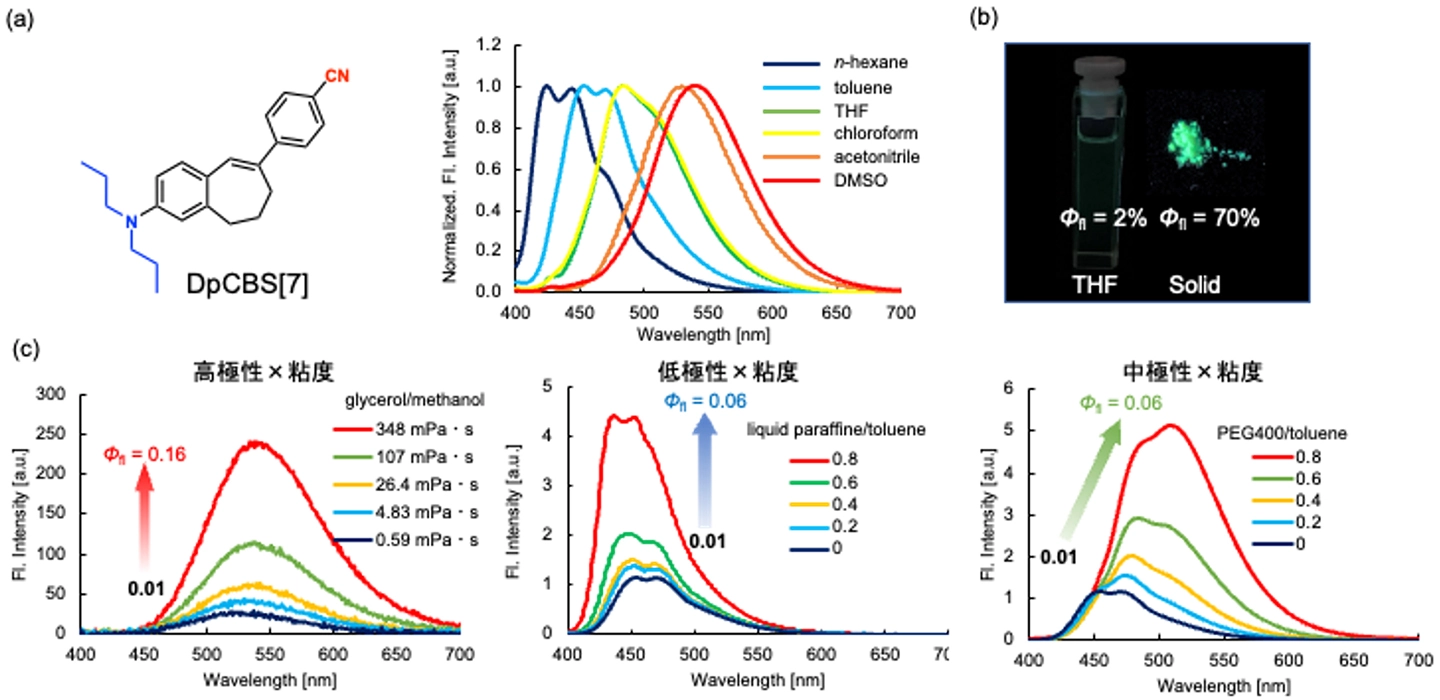 (c)極性および粘度の異なる環境における蛍光スペクトル。分子運動が粘度や凝集によって抑制されると、環境の極性に応じた発光色を示すことが分かる。